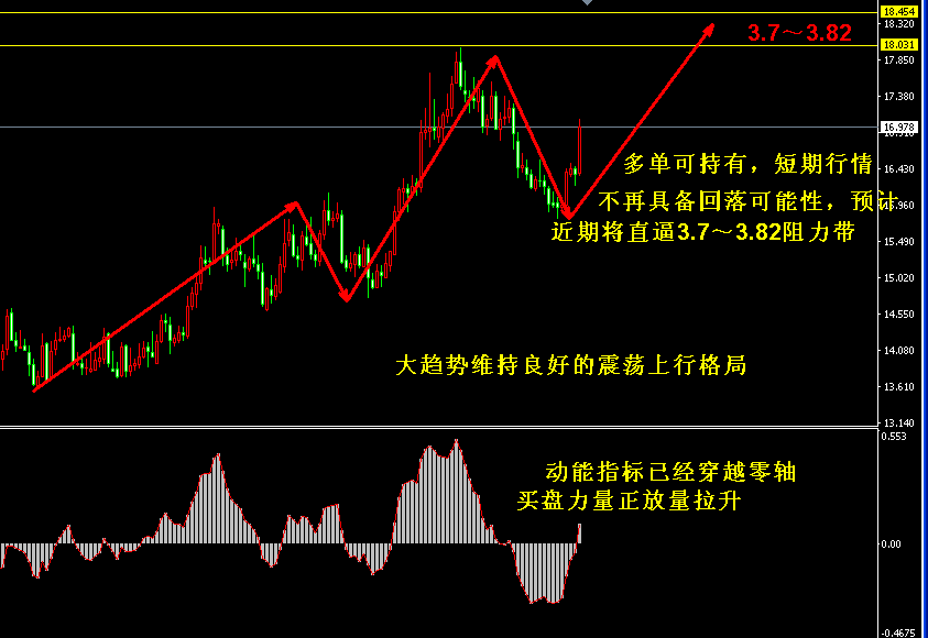 目前纸白银价格是3.594元/克。昨日纸白银大幅拉升,在突破止跌企稳信号点3.49后获得了充足的买盘动能,银价重新回归到强势上行格局之中,目前走势正开始新一轮上涨,此次上涨将测试中线阻力带3.7~3.82。正如我们之前所说,纸白银大趋势为上涨格局,当短线下跌行情遭遇大趋势支撑后,短期走势将有极大可能迅速发生趋势变化,这种变化以顺应主趋势为主。果不其然,银价自上周回踩3.32大趋势的50%强弱支撑位后,走势便逐渐发生了转变,先是短期4小时周期打破下跌格局,接着近期日线周期突破下跌趋势线与止跌信号点。如下图所示为纸白银日线走势图,正如图中红色箭头所示,目前纸白银正维持良好的震荡上行格局,这种格局将持续推升银价向上再度测试3.7~3.82阻力带。由于目前日线动能指标MACD已经转入零轴上方,买盘动能正进入放量拉升阶段,预计近期行情有望直逼3.7~3.82的可能性较大,而短期不再具备大幅回调的需求,投资者可坚定持有多单,等待到达目标区域后逐渐获利离场。对于仓位较轻的投资者,近期若发生小幅回落,则可继续采取分批加仓的方式,切勿盲目追多,当前价格已经濒临高位,再追多的利润正在缩小,并不值得尝试。综合分析,此轮调整经历了数周后终于在趋势支撑位发生反转,这足以说明了当前上涨走势仍然处于延续状态,在趋势没有改变之前,行情将维持如图中红色箭头所示一样,始终进行着震荡上行格局。未来投资者关注3.7~3.82中线阻力带,此处若无法突破,恐再度迎来一次回调行情;反之,突破3.82后,银价将很快迈入4元大关。我们建议投资者采取波动布局+中线布局的策略,波段布局需要在每次行情遇到重要阻力后做获利了结,等其突破或回落后重新安排下一次布局,此次波段布局的目标将暂时看至3.7~3.82。(注: 由于纸白银价格是国际银价换算而来,而换算过程中涉及到人民币对美元汇率的变化,即使在国际银价不变化的情况下,如果人民币贬值或升值,也会导致纸白银价 格出现变动。因此,我们的分析 只采用最新的国际银价对应的人民币白银价格,如与过去分析价格有出入, 投资者应知晓其原因。)