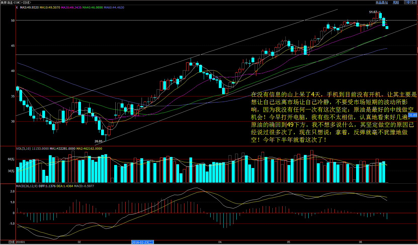 白银走势近期处于强势,如下图所示,我们从大的区间来看,目前还是处于底部震荡区域之中。后期行情在15.8~17.8宽幅震荡的概率较大。如果我们从K线组合看,15.8~13.6为头部,左边圆圈为左肩,右边圆圈正形成右肩。如果是这样,我们从左肩的时间上看,今年下半年乃至明年初,市场都将是一个形成右肩的过程:换言之,在这段时间内市场都将维持15.8~17.8的大区间震荡,那么在17上方可以尝试布局空单,在16下方布局多单,波段操作即可。 但是,从今年以来的红色箭头表示的上升通道来看,市场处于震荡上行之中,市场略显强势,所以空单可以选择观望,等待回落分批做多即可。 再来看看原油走势,原油前期一直见顶的在50上方布局空单,虽然行情在50上方震荡多日,并有所突破,不过目前油价已经回归到49下方。目前原油有明显的见顶迹象,前期建议在50上方做空仍然继续维持该思路,见到反弹即可做空,下半年行情仍有较大利润。目前原油在高位已经出现严重的超买和顶背离。