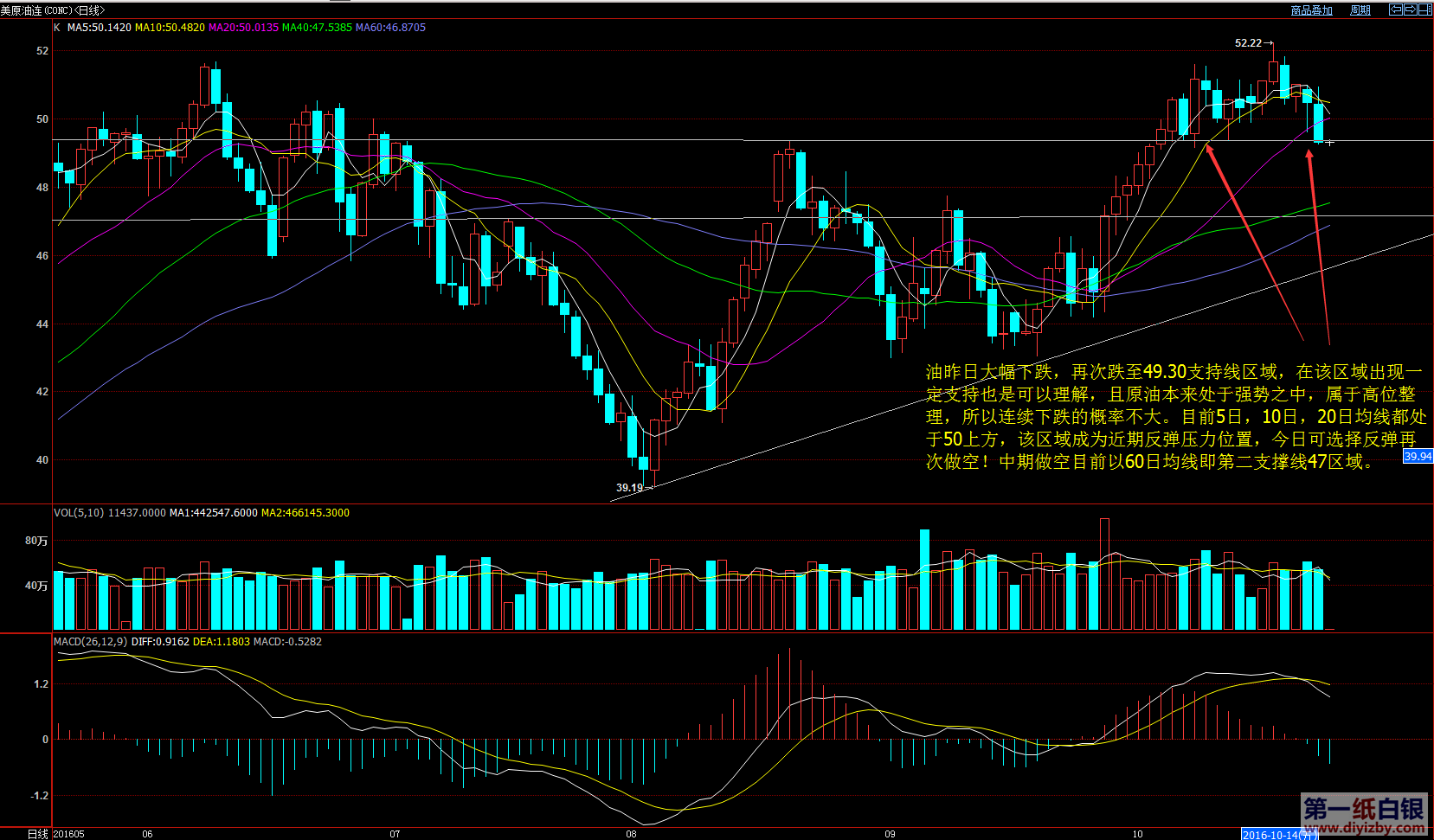 白银昨日延续反弹,又运行于5日均线和10日均线上方,近期低点正逐步抬高,多头略占优势,技术指标也显示偏多。目前急需一根大阳线来远离底部区域奠定多头基础,目前建议投资者仍然谨慎持有多单保持观望。 后市银价预计仍有回踩机会,目前追多尚不明智,前期多单做好止损17.3下方即可持有,保持观望或等待回踩。 再来看看原油走势,昨日油价大幅下跌,再次跌至49.3支撑线区域,在该区域出现一定支撑。目前原油整体格局仍然处于强势之中,属于高位整理行情,所以后市连续下跌概率并不大。 目前的5日、10日、20日均线都处于50上方,该区域或成为近期反弹压力位,今日建议选择反弹继续做空,建议在50附近进场,中期目标看至60日均线的47支撑位。