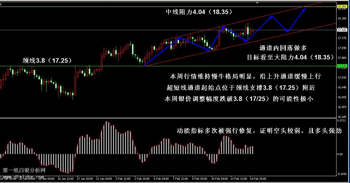 目前纸白银价格是3.942克。昨日白银价格继续收涨,虽受到美联储主席耶伦鹰派言论打压,银价在消息公布后迅速冲高回落,但其后又触底反弹收复跌势,由此显示当前市场并非完全依赖美联储加息预期,欧洲政局不稳定和特朗普的不确定性增加了金银的避险买盘。技术形态上,银价日线缓慢拉升,虽然每日波幅不大,但较前期高点已经明显抬升,正向着第二中线阻力4.04(18.35)附近逐渐靠拢。如下图所示为白银4小时周期走势图,从图中红线所示通道来看,本周行情维持了慢牛格局,银价超短线沿着通道震荡上行,由于该通道起始于“头肩底”颈线支撑3.8(17.25)附近,因此推测本周行情跌破3.8(17.25)的可能性极小。目前随着时间推移,通道亦在不断上升,最终带领银价交汇于大阻力4.04(18.35)附近后恐遭遇一轮强压,在此之前投资者均可保持通道内回落分批做多的思路,着重在3.8(17.25)支撑上方进场即可。另外,从近期超短线的动能指标走势来看,银价曾多次面临短线顶背离和超买情况,不过行情仅仅通过小幅回落便完成强行修复,由此说明了空头力量薄弱,另一方面也说明了多头买盘支撑强劲,而且通过历史分析得知,这种强行修复指标偏离的情况大多发生在趋势行情之中,这便更加肯定了当前多头行情不改变的事实。综合分析,技术面的好处在于一旦行情形成了趋势,这种趋势的延续性便会持续很久,即使消息利空,市场也仅仅出现短暂调整修复,大格局将始终不变。趋势的改变必须配合二个要素:1.银价大幅冲高后导致日线或中线出现了多头力量减弱的迹象,此时暗示长期买盘支撑衰减;2.银价处于较为重要的中期阻力附近,且发生了多头向空头转变的过程,这种过程称之为见顶形态。上述2个条件满足后,大趋势才发生调转(多转空和空转多类似)。由于年初已经完成了头肩底形态的构造,此时行情亦完成了“空转多”格局,目前走势仍延续多头趋势,且未出现任何见顶形态和风险,因此我们依旧坚定看好未来银价继续上涨。(注: 由于纸白银价格是国际银价换算而来,而换算过程中涉及到人民币对美元汇率的变化,即使在国际银价不变化的情况下,如果人民币贬值或升值,也会导致纸白银价格出现变动。因此,我们的分析只采用最新的国际银价对应的人民币白银价格,如与过去分析价格有出入, 投资者应知晓其原因。)
