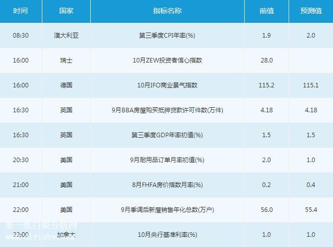 欧洲时段,投资者需关注16:00公布的德国10月IFO商业景气指数、瑞士10月ZEW投资者信心指数。此后,投资者需关注16:30公布的英国第三季度GDP年率初值、英国9月BBA房屋购买抵押贷款许可件数。