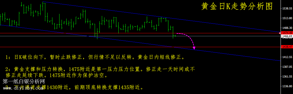 1:黄金的支撑和压力转换,1475从支撑位置变成压力位置,因此1475上下沽空看跌向下。