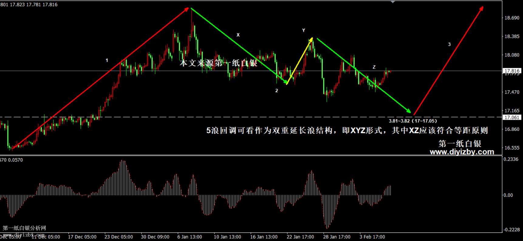 白银短线策略:(主趋势看涨,短线处于回调中,近期策略维持不变)。 为了更简化2浪回调形态,我们可将回调浪视作为XYZ的回调模式。如下图所示为白银4小时周期走势图,可将目前走势向下回调的5浪形态视为图中黄绿箭头所示的XYZ浪模式。即走势由两个延长浪和一个反弹浪组合形成。其中XZ均为延长浪形态,其应该符合XZ等距原则,即Z浪回调不应该小于X浪回调幅度。基于上述形态和距离推测,走势若能向下回踩至3.81~3.82(17~17.05)附近,则整体的双重延长浪结构是完整的。