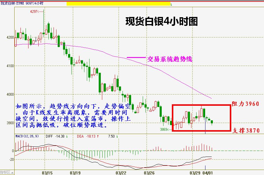 1, 日线收取带长上影线的阴十字星,布林带继续开口向下且银价运行于下轨附近,均线系统呈现空头排列, MACD死叉缩量,后市仍将维持震荡偏空格局。 2, 4小时布林缩口走平,均线系统运行于K线上方并形成强阻力,MACD低位金叉修正,短期趋势偏弱,关注上方阻力3920、3960,下方支撑3870、3820。 3, 小时图黄色趋势线走平,说明短期进入震荡市,日内操作可维持3870-3960区间高抛低吸为主,破位顺势跟进。 今日关注消息: 2014-04-01 11:30 澳大利亚4月央行利率决议 2014-04-01 15:55 德国3月失业率 2014-04-01 15:55 德国3月制造业采购经理人指数终值 2014-04-01 16:00 欧元区3月制造业采购经理人指数终值 2014-04-01 17:00 欧元区2月失业率 2014-04-01 21:00 美国3月Markit制造业采购经理人指数终值 2014-04-01 22:00 美国3月ISM制造业指数 2014-04-01 22:00 美国3月营建支出月率 第一纸白银分析网(www.diyizby.com)北京时间10:43监测数据,工行纸白银价格3.909元/克。 本文作者昨日白银价格分析请看:德裕金号:白银下跌趋势未变,短线急需回调震荡